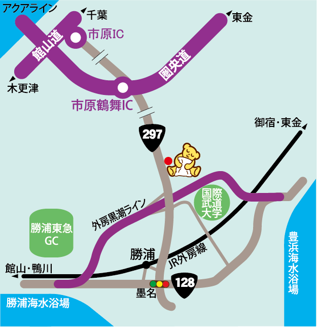 圏央道「市原鶴舞IC」下車、国道297号を勝浦方面へ約29km左側。