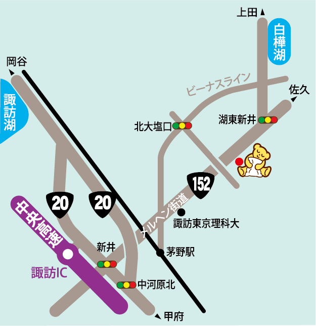 中央自動車道「諏訪IC」から約7km、メルヘン街道(国道152号)沿い。