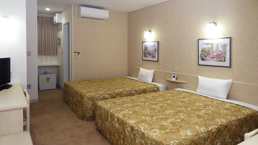 全室にクイーンサイズベッドを2台設置しております。ひとつのベッドが幅154cmでダブルベッドより一回り大きいサイズですので、それぞれに2名は十分お休みいただけます。したがって、1名からご家族4~6人まで1室でお泊りいただけますが、ご希望により、エキストラベッド(シングルサイズ)をご用意させていただきます(1台2,200円/1泊)。