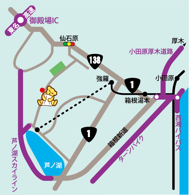東名・御殿場ICから約14km、芦ノ湖畔から約2.6km。箱根観光にたいへん便利。