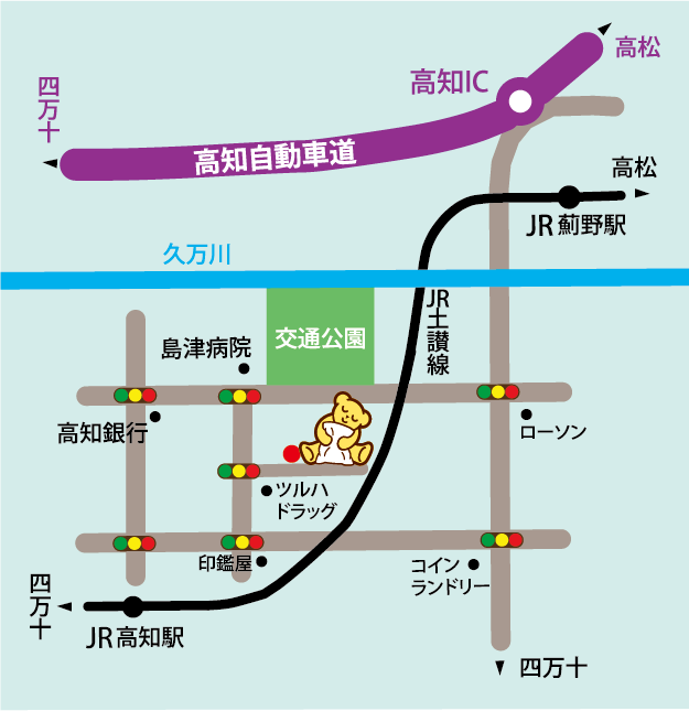 高知道・高知ICから約3km、JR高知駅から800mと自動車でも鉄道でも至便です。