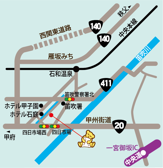 中央高速「一宮御坂IC」から約6km。富士山周辺・山梨・八ヶ岳・信州を楽しむ拠点に。
