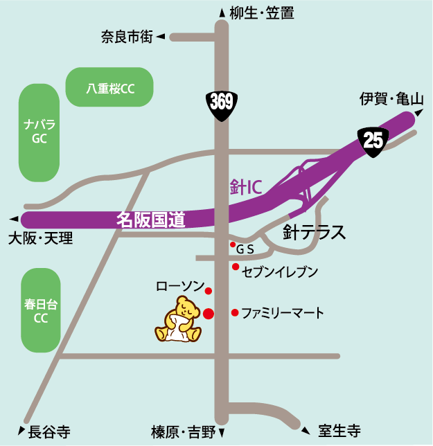 大阪と名古屋を結ぶ名阪国道・針ICから約1.5km、国道369号線沿い。