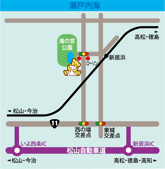 松山自動車道「新居浜IC」から約6km、 新居浜駅から約1.3km、滝の宮公園そば。