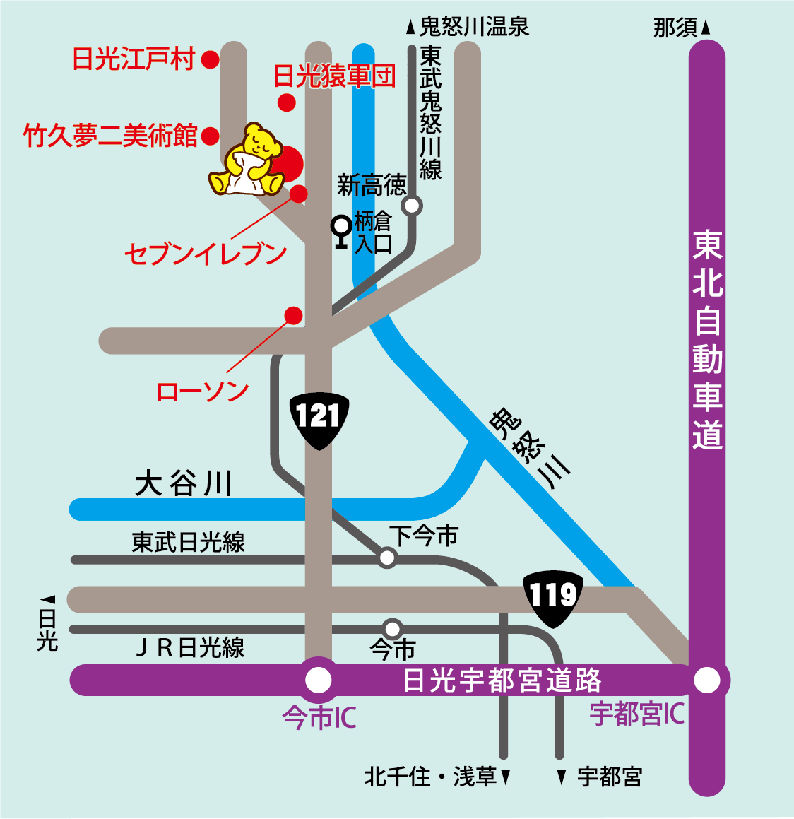 日光宇都宮道路「今市IC」下車、そのまま国道121号線を鬼怒川温泉方面へ。道なりに約9km直進、セブンイレブン脇の信号を左折200m。