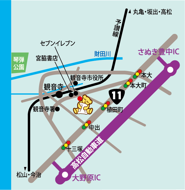 高松道「さぬき豊中IC」から約6km、「大野原IC」より約5km。