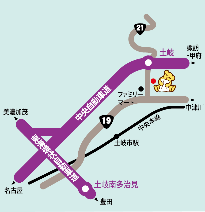 中央高速自動車道「土岐IC」出口を右折200m先左側、国道21号線沿い。(東名高速からは、豊田ジャンクションで東海環状自動車道に入り、土岐ジャンクションで中央高速に入ってすぐ土岐インターです。
