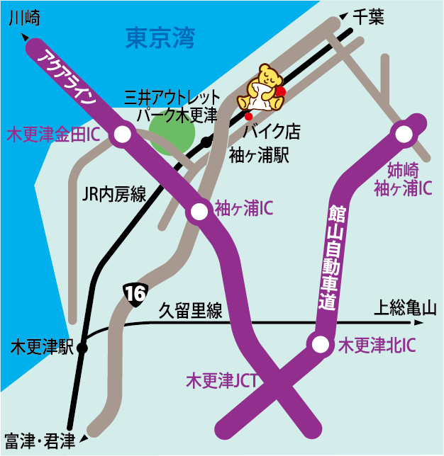 東京湾アクアライン・袖ヶ浦インターから約4km、県道287号線沿い。木更津市街に約10km。